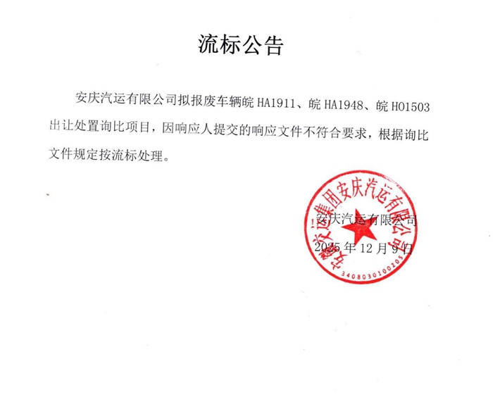 擬報(bào)廢公務(wù)車皖HA1911、皖HA1948、皖HO1503出讓處置流標(biāo)公告